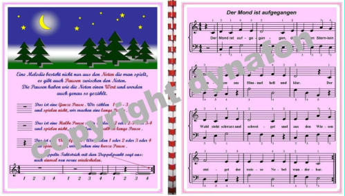 InhaltsverzeichnisBienchen summ herum - Hänschen klein - Der Mond ist aufgegangen Ode an die Freude (Ludwig van Beethoven) Leise rieselt der Schnee - Greensleeves - Au Claire de la Lune - Aura Lee - Für Elise (Ludwig van Beethoven) - An der schönen blauen Donau (Johann Strauss) - Jingle Bells